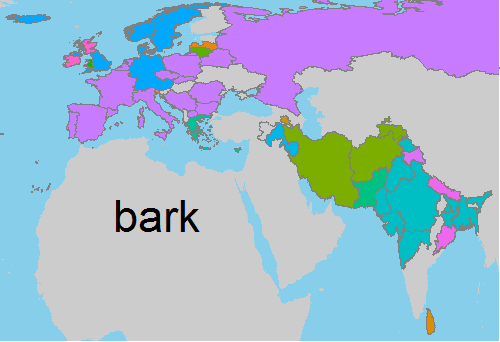 The following table is not complete. It uses only the words that either went into the map on this page (plus Lahnda), or would have done but for irregular or multiple cognate classes. See the IELex page for bark for the full table. Cognate classes in brackets denote loanwords.