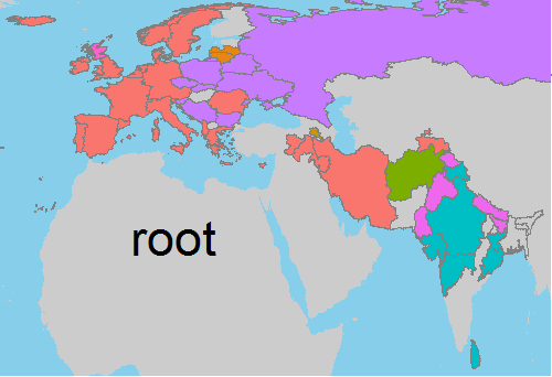 The following table is not complete. It uses only the words that either went into the map on this page (plus Lahnda), or would have done but for irregular or multiple cognate classes. See the IELex page for root for the full table. Cognate classes in brackets denote loanwords.