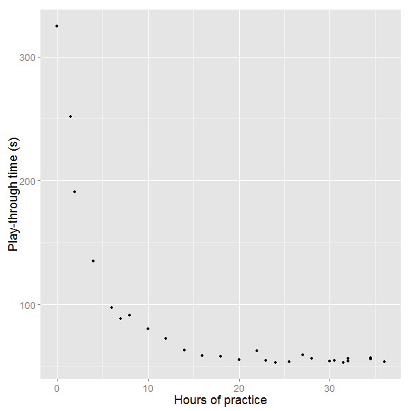 ylab("Play-through time (s)") + xlab("Hours of practice") +