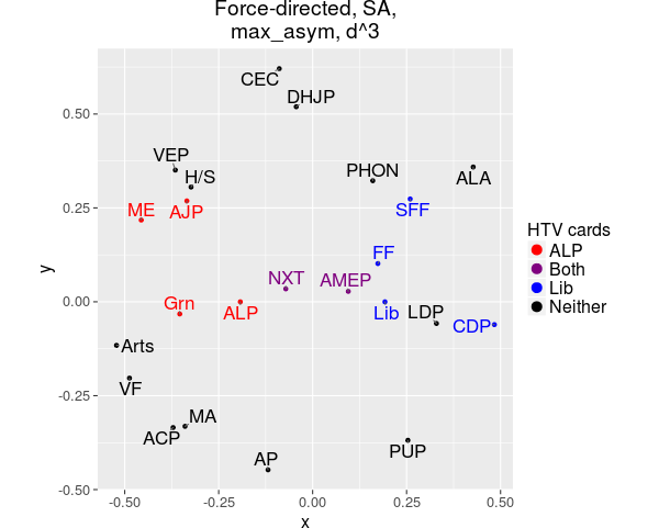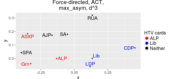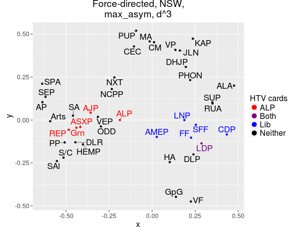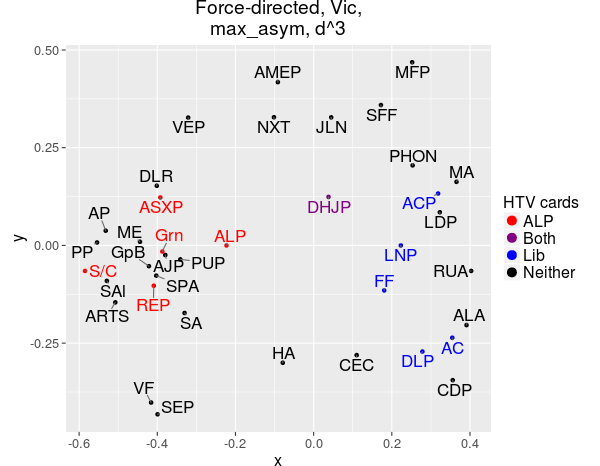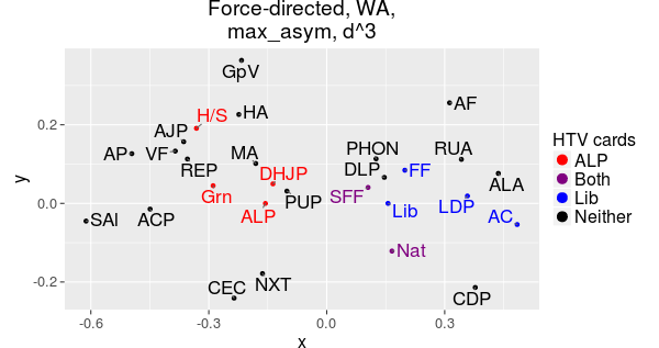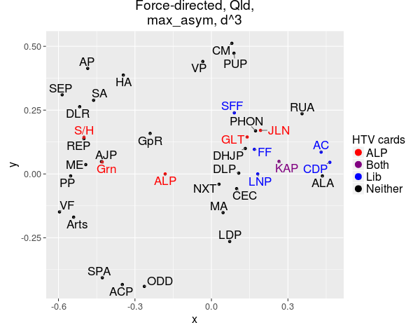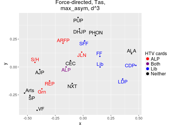 It's a little surprising to see KAP to the right of the LNP. But in the force-directed graphs, the majors' HTV cards don't dominate the statistics as much as they do in PCA (roughly, since the distance between each pair of parties is weighted equally), and presumably Katter is a lot more popular amongst voters for right-wing parties.