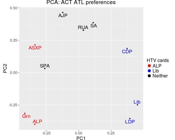 (Here I've replaced all blank preferences with 38. Doing PCA on data with missing values wasn't something I wanted to learn, so I had to replace the blanks with something. Replacing with 7 doesn't qualitatively change these toy results much. I did a quick test on the Victorian results. Replacing blanks with the next preference (e.g. a 7 if the voter wrote 1-6) drastically distorted the axes, but the effect of the HTV cards was still clear. Replacing blanks with the number half-way between the next preference and the number of groups (e.g., (7 + 38)/2 = 22.5) gave very similar results to what is shown below.)