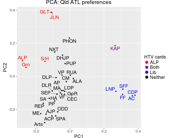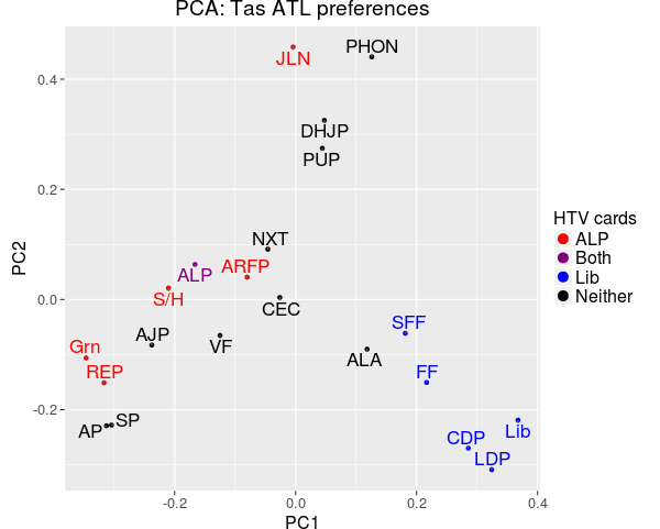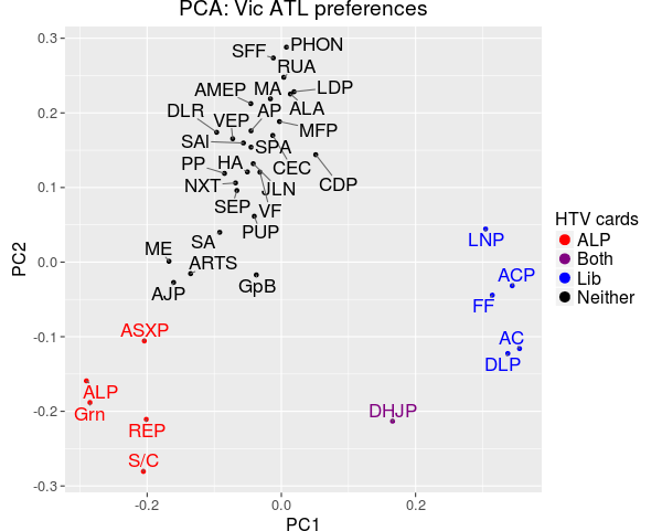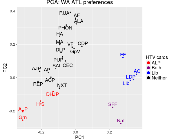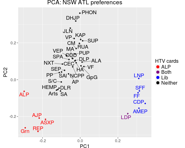 The second principal component neatly separates the non-major-HTV parties into a spectrum with One Nation at one end and the Arts Party and Sustainable Australia at the other. The LDP was on Labor's HTV card but there's only the barest suggestion of it in these statistics. The close preferencing link between the Liberals and the Liberal Democrats is also shown by the raw preferencing numbers: less than 30% of (ATL) Labor voters put the LDP in their first 6, but almost two thirds of Coalition voters did. (The converse preferencing rates were similar: 31.5% of LDP voters preferenced Labor in the first 6, and 65.7% preferenced the Coalition in the first 6.)