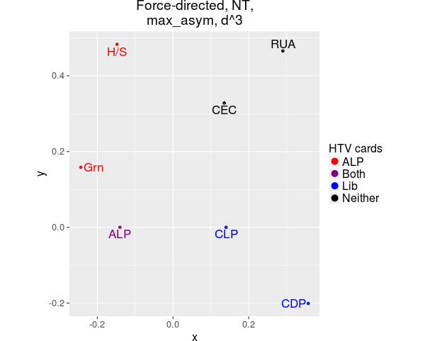 I don't think my choices of parameters and algorithms are in any way definitive, and in that spirit I've put some semi-cryptic titles in the plots below. The 'max_asym' is my term for replacing blanks with the number of groups (the maximum possible preference), and using asymmetric distances: working out the average distance from, e.g., NXT primary votes to Liberal preferences separately from Liberal primary votes to NXT preferences, and then averaging the two at the end. (Using symmetric distances usually results in very circular arrays of points, with popular parties at the bottom and micro-parties at the top.) The d^3 indicates that I cubed all distances.