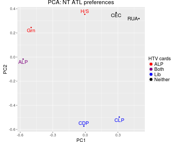 In the more populous states, the PCA clearly generates clusters based on the major parties' HTV cards. Part of this might be an artefact of me setting blank preferences to the number of groups (for NSW, 41). This number is big when there are lots of groups on the ballot paper, and perhaps this exaggerates the effect of the HTV's. There's also a lot more ways for preferences to scatter when a voter deviates from the card, which should make for weaker relationships between a major party and parties not on the HTV.