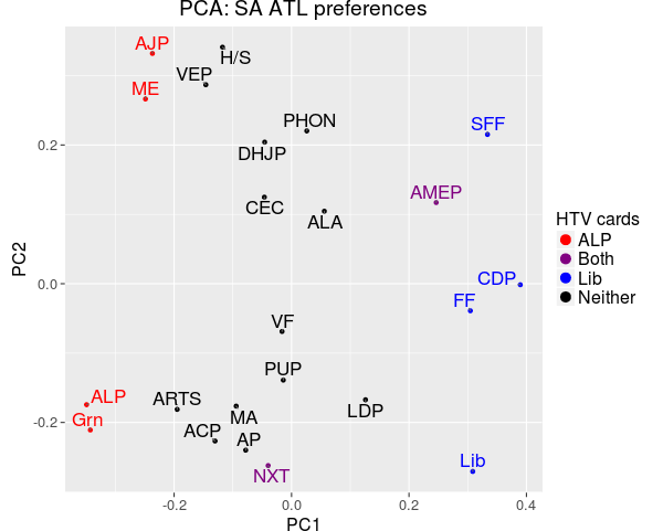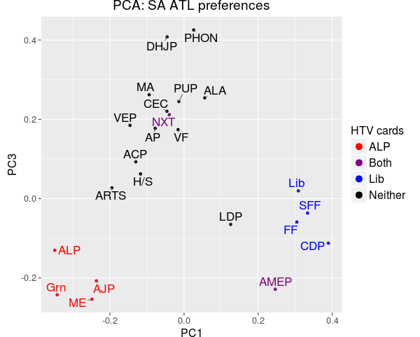 The plot of PC1 and PC3 shows the usual pattern of these plots, with the main South Australian variant being NXT, which ends up in the middle of the non-HTV pile. (Note that the LDP is coloured in black here, but it was on a minority of Liberal HTV cards.)