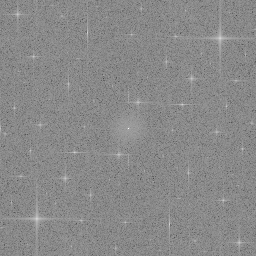 There are very noticeable bands running across the image. Less noticeable (I only saw them after taking the average value across each band and subtracting it off the image) are bands running in other directions. In any case, the regularity of the noise bands suggests the use of a Fourier transform. The transformed image is the same size as the original but the pixels now have complex values. Rather than splitting them into real and imaginary components, it is more useful to separate into magnitude and phase (z = magnitude * exp(i*phase)). Here is the magnitude of the FFT (two F's, for "fast Fourier transform", the algorithm used to compute it):