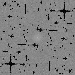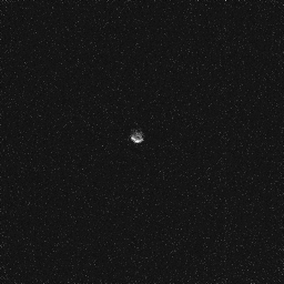 It's still noisy, but Phobos seems a bit brighter than the background. Re-scaling the brightness ought to bring out the contrast a little. Suppose the pixel values are on a scale from zero to one. Pick a value, say 0.4 (the actual value I used depended on the median pixel value in the filtered image), that we hope Phobos's brightness is greater than. Then squish any pixels in the 0 to 0.4 range down to 0 to 0.1, and spread out pixels from 0.4 to 1 across 0.1 to 1. Here is the result: